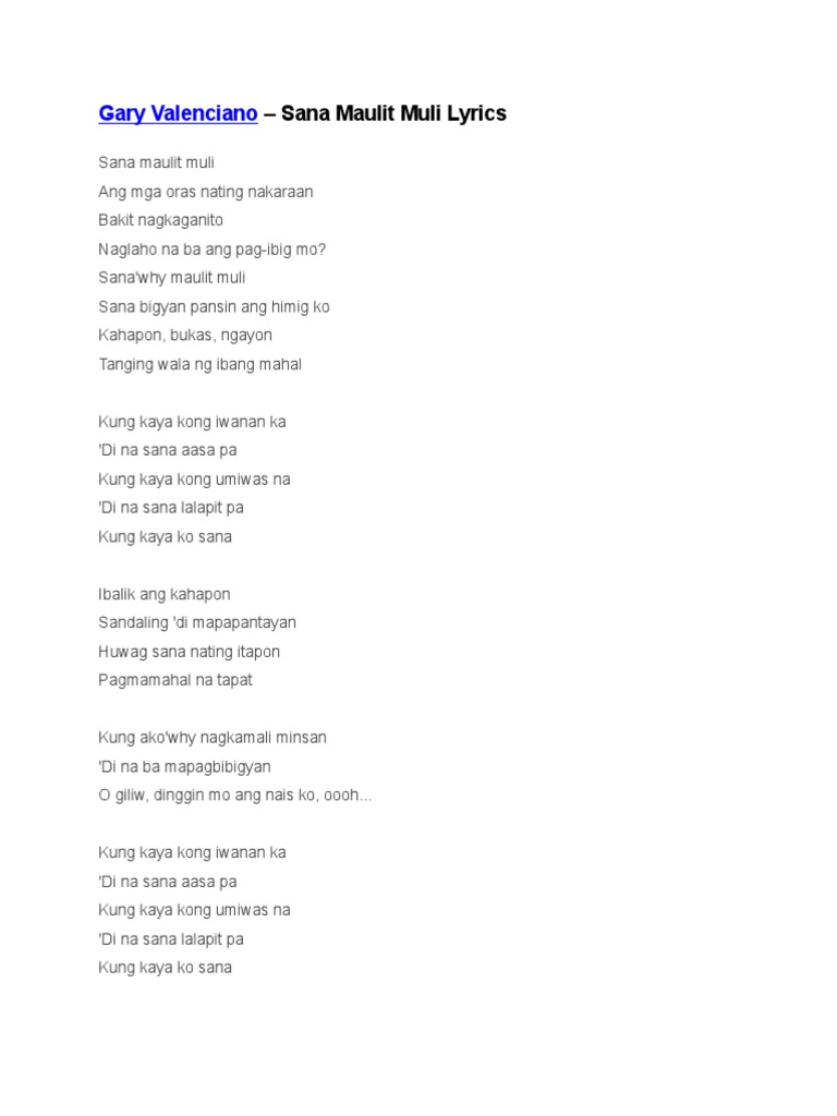 Sana Maulit Muli Lyrics. Sana Maulit Muli LYRIC Print Sana maulit muli Ang mga oras nating nakaraan Bakit nagkaganito Naglaho na ba ang pag-ibig mo Sana maulit muli Sana bigyan ng pansin ang himig ko Kahapon bukas ngayon Tanging wala nang ibang mahal Chorus Kung kaya kong iwanan ka Di na sana aasa pa Kung kaya kong umiwas na Di na sana lalapit pa Kung kaya ko sana. Official Lyric Video Sana Maulit Muli - Gary Valenciano KylaSubscribe to the channel.
